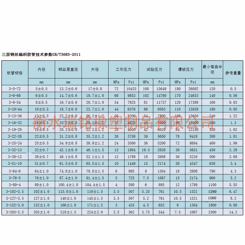 产品结构:主要由耐液体的合成橡胶内胶层、中胶层、Ⅰ、Ⅱ、Ⅲ层钢丝编织层、耐天候的合成橡胶外胶层组成,内胶层具有使输送介质承受压力,保护钢丝不受侵蚀的作用,外胶层保护钢丝不受损伤,钢丝层是骨架材料,起增强作用。