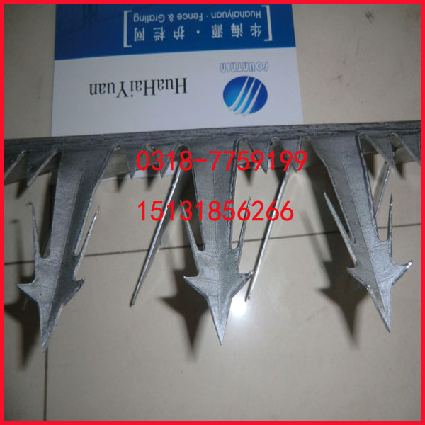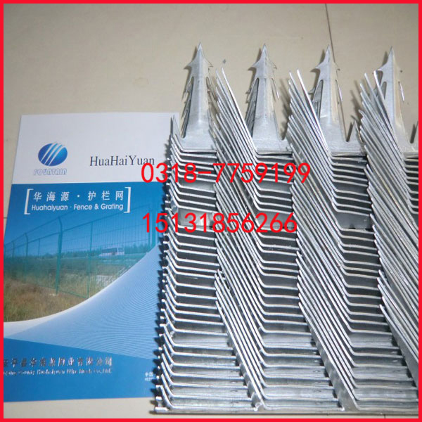 围墙防爬防盗刺钉材质:镀锌钢板,不锈钢板,镀锌+彩色PE喷涂,颜色可以根据客户需求定做。
