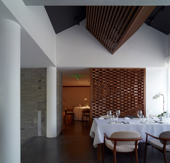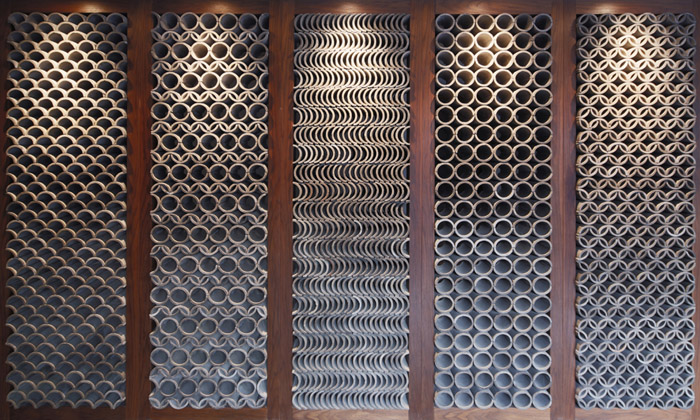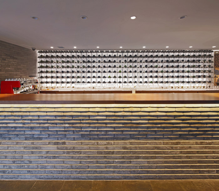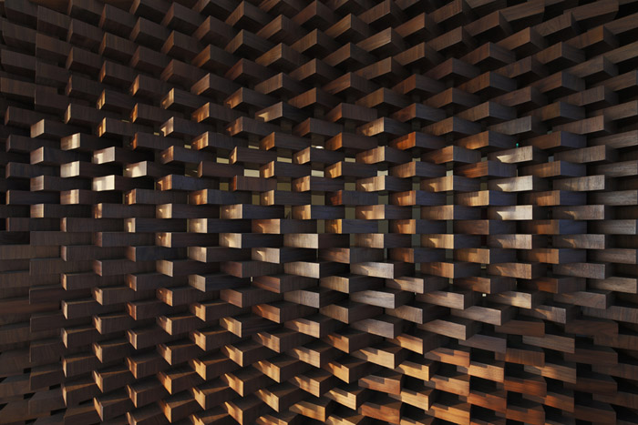 材料:我们采用了传统材料当代做法的策略。从四合院中提炼取了木、砖、瓦等典型材料,用非常规的使用和建造方法来组织它们:将木作成砖来砌筑;砖叠涩本是墙的砌法,但被移植过来作吧台;屋顶上用的瓦则用来搭屏风;等等。其目的是想达到传统和现代的共生与结合。
