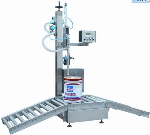 JYTC-50型称重式气动灌装机,原理是由称重传感平台在微电脑程序控制下设定计量。灌装时先去除皮重。物料在注入容器时先大量快速进料后慢速小计量修正计量。操作者只需将容器放入平台,口对下料嘴,此时程序启动,下料嘴下降,打开灌装阀进料,当达到设定量时自动停止补料,下料嘴上升,完成灌装过程。