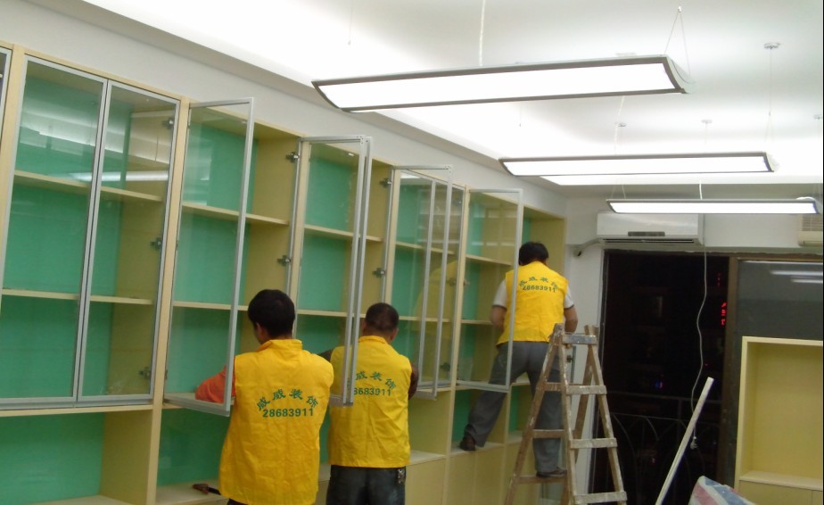 铺地板、木板打磨打蜡、铺地毯、做厨柜、吊柜、地柜、隔木板墙、石膏板隔墙、制作招牌、吊顶造型、包门套、窗套、制作各累衣柜、办公柜、展示柜、迎宾台、货架、玻璃柜、屏风制作、石膏线吊顶、地脚线、天花线、各种门窗等。