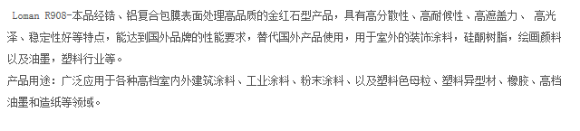 Loman R908经锆、铝复合包膜表面处理高品质的金红石型产品,具有高分散性、高耐候性、高遮盖力、高光泽、稳定性好等特点,能达到国外品牌的性能要求,替代国外产品使用,用于室外的装饰涂料,硅酮树脂,绘画颜料以及油墨,塑料行业等。