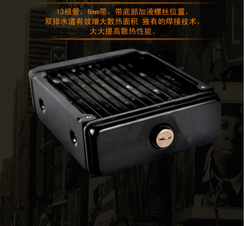 | 产品工艺 | 13根管,6mm带,带底部加液螺丝位置,双排水道有效增大散热面积 独有的焊接技术,大大提高散热性能。 |