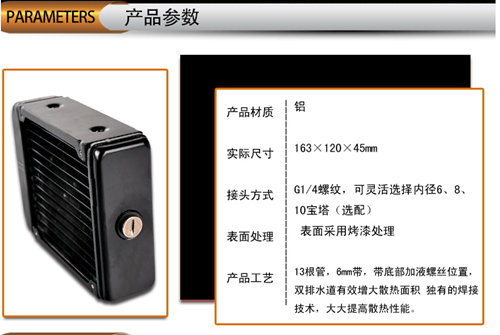 | 用途 | 水冷散热 | 规格 | 163×120×45mm |